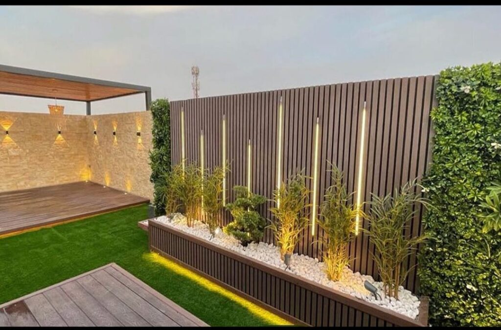 خبراء تنسيق حدائق منزلية بأفضل النباتات، الأشجار، والعشب الصناعي أو الطبيعي، مع جلسات خارجية أنيقة وتوزيع إضاءة مثالي.